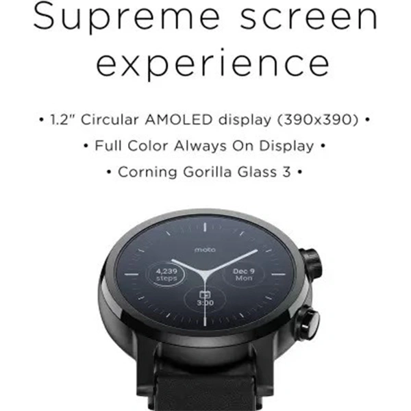 - Elegant Design: The Moto 360 (3rd Gen) features a sleek, minimalist design with a round stainless-steel case, which gives it a premium, classic appearance that closely resembles a traditional analog watch. The case is available in multiple colors, including black, silver, and rose gold, allowing for a refined, luxurious look.
