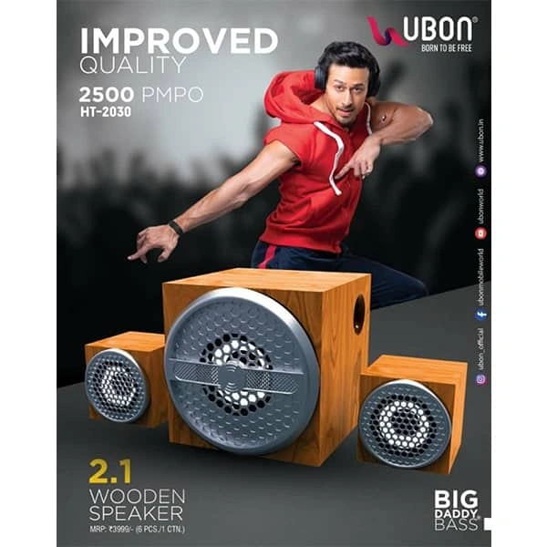 Enhance your home entertainment experience with Ubon HT-2030 2.1 Wooden Speaker System. This speaker which offers a rich bass and crisp vocals is compatible with Apple as well as Android devices with Bluetooth 2.1 or above. It has five compact satellite speakers with a centre channel speaker. Each satellite speaker features a single 4Ohm Sub-woofer delivering vibrant surround sound effects. The center-channel speaker has 2.1" woofer reproducing the middle range sound with clarity